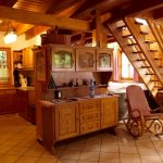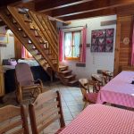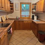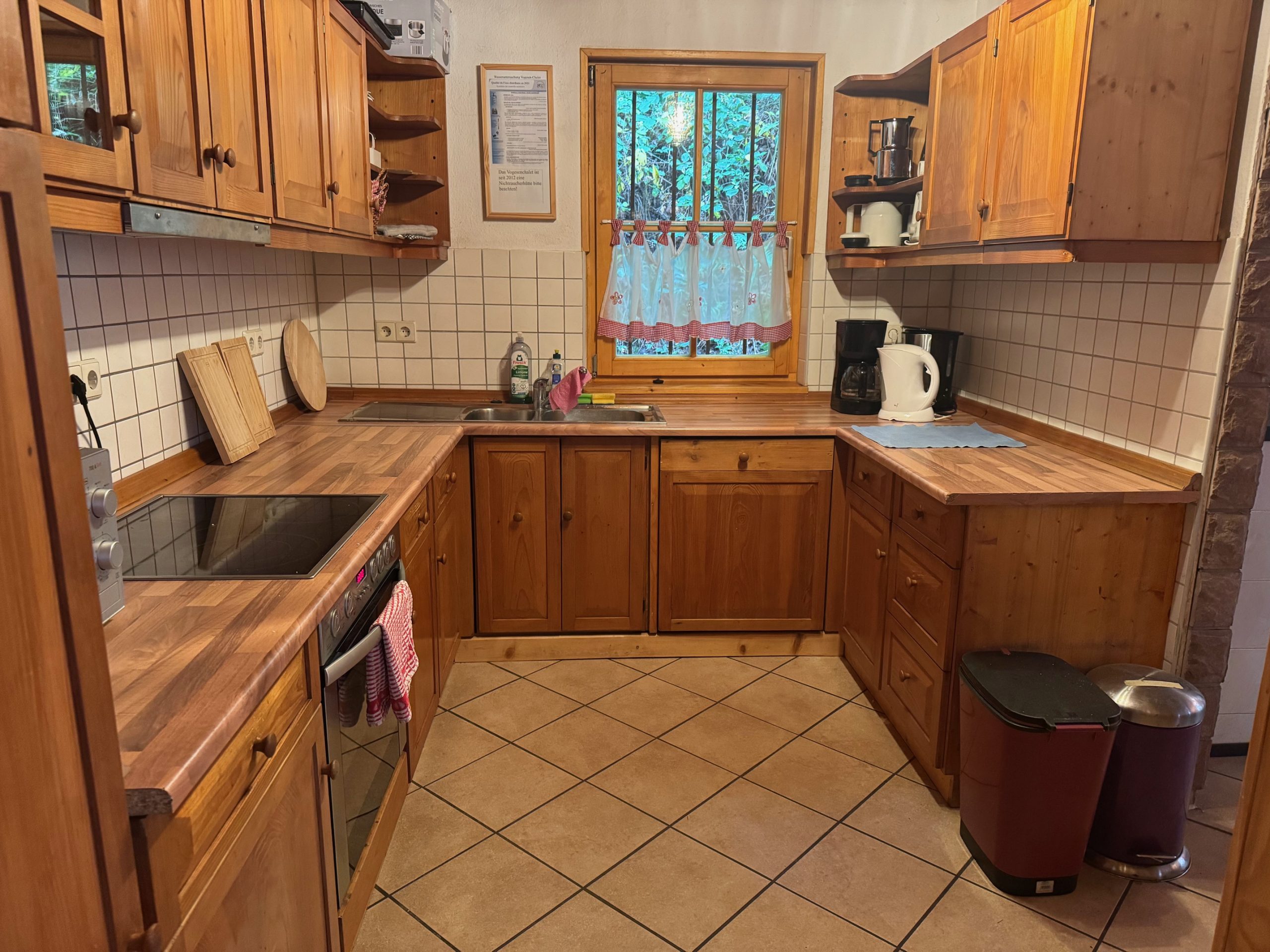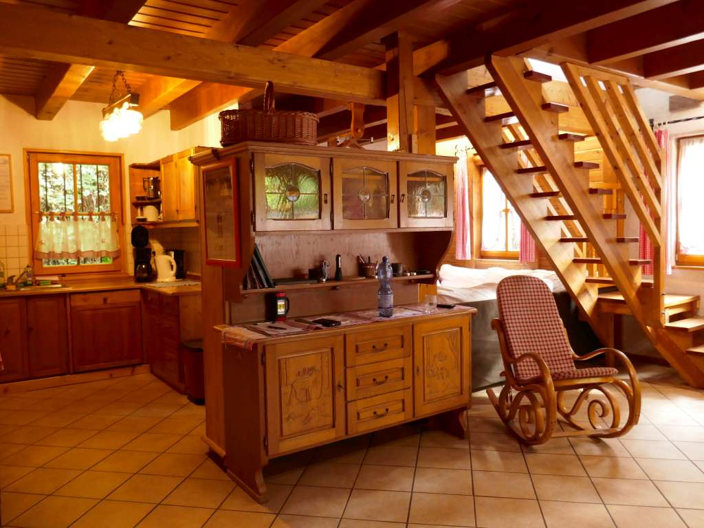 Holzbalkendecke, die Wände zum Teil mit hellem Rauputz und mit Holz vertäfelt, offene Einbauküche, 2 Duschen, 2