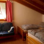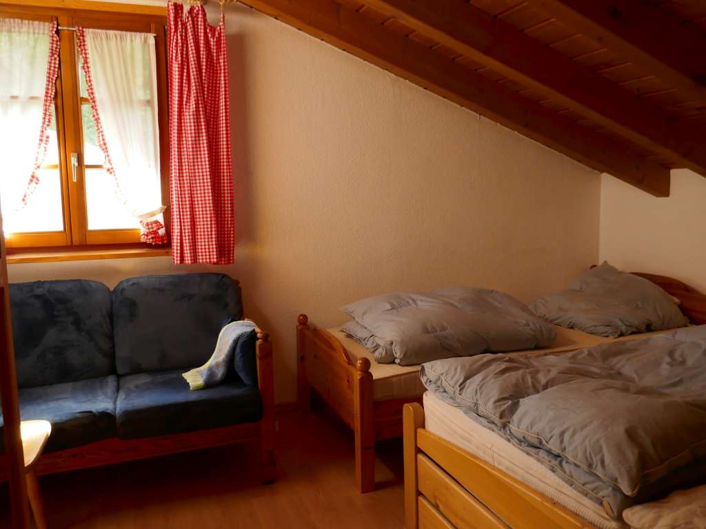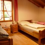 Holzsprossenfenster mit Isolierverglasung und Klappläden, Bodenfliesen bzw. Laminatböden, Holzbalkendecken,